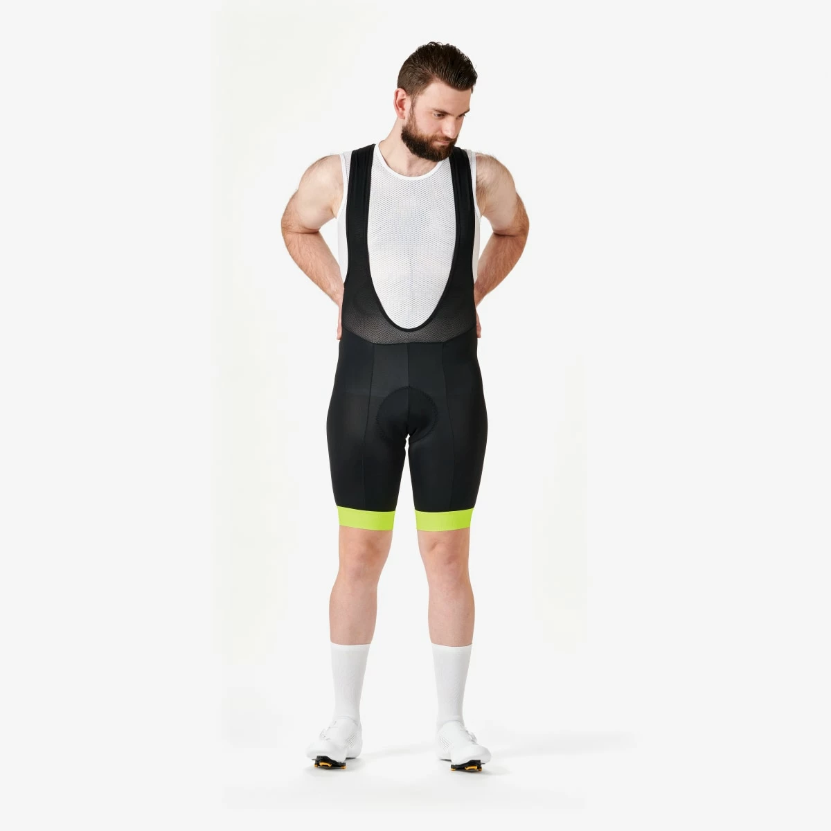The ROSE CORE FLUO bib II bib shorts feature eye-catching leg cuffs with electric yellow colour print. They are the perfect functional basic shorts for your road cycling kit. The bib shorts are ideal for summer rides – lightweight stretch material and breathable mesh straps ensure a pleasantly dry feeling and good ventilation. The ROSE CORE bib II shorts have been further developed and optimised. Enhanced seam lines and longer legs increase comfort. The elastic, wider leg cuffs with a light silicone gripper on the inside fit close around your legs and reduce slipping of the bib shorts while pedalling. Thanks to the soft, comfortable R CLASSIC M seat pad, the bib shorts are well suited for short to medium distances. They are absolutely essential for your cycling wardrobe and can be combined with all styles from the ROSE CORE FLUO collection.